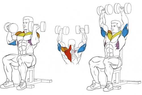 Жим гантелей параллельно сидя. Данное упражнение рекомендуется либо новичкам, либо тем, у кого была наблюдалась травма плечевого сустава. Выполняется аналогично обычному жиму гантелей, однако ладони во время движения смотрят вовнутрь. Рабочий вес — средний.