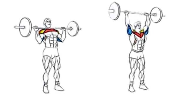 Данное упражнение развивает трапециевидные и передние дельтовидные мышцы, заставляя их увеличиваться в размере. Чем шире хват штанги, тем больше нагрузки переходит с трапеции на дельты — поэкспериментируйте и выберите тот хват, который вам наиболее подходит.
