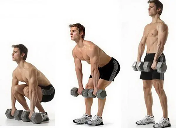 - держа спину прямой, согните ноги в коленях, одновременно наклонившись вперёд до угла примерно в 45 градусов; наклоняться нужно до положения, в котором гантели коснутся пола;