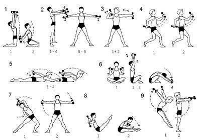- Стоим прямо, в руках гантели, руки свисают вдоль туловища. Медленно поднимаем и опускаем плечи, руки при этом не напрягаем, работаем только мышцами шеи и спины. Повторяем 10 раз.
