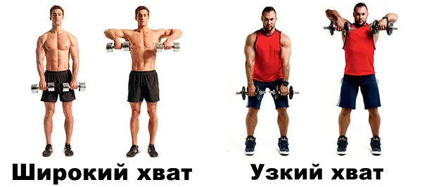 - исходная позиция (ИП) – ноги чуть уже плеч, гантели в опущенных руках;