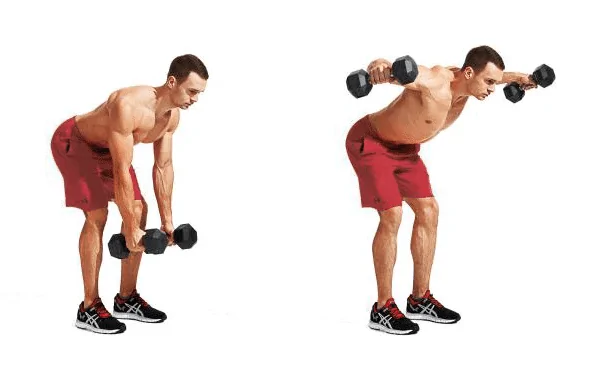 - Встаньте прямо, возьмите в руки гантели. Нагнитесь таким образом, чтобы корпус был параллельный с полом. Подтягивайте руки к себе и разводите их в стороны. В это время работают мышцы рук, лопаток и межлопаточной области. Повторите 10 раз.