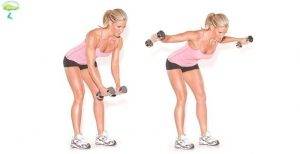 Данное упражнение относится к тренировкам с гантелями в домашних условиях или в тренажерном зале. Встаньте в исходное положение (ноги на ширине плеч, согнутые колени, наклоните корпус вперед). Гантели берутся в руки, немного согнутые, нейтральным хватом. Руки разводятся вверх до положения параллельно полу, затем медленно сводятся вниз Локтевой сгиб сохраняется постоянно.