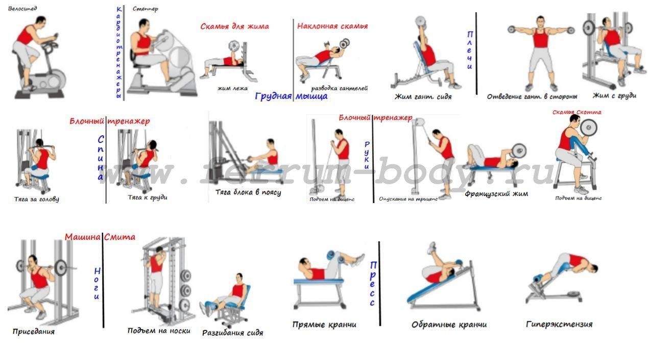 - Выполнениеупражнений. Собственно, сама тренировка по выбранной программе. Как правило, она состоит из 4-8 упражнений. Каждое выполняется в 3-4 сета (не считая разминочных) по 6-12 повторений. Отдых между сетами – 1-2 минуты.