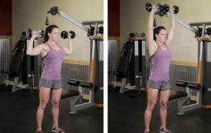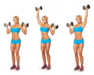 - Выпрямите руки и поднимите гантели прямо над головой.