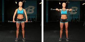 | 2. Подъем штанги перед собой С изогнутым грифом 4 подхода, 12, 12, 10, 10 повторений | ![]() |