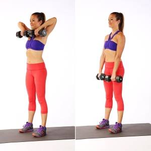 - Гантели поднять на уровень шеи. Локти согнуть под прямым углом.