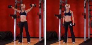- Распрямляя руку, выжимаем гантель вверх. Задерживаемся в максимальной точке несколько секунд, следим, чтобы руки находились параллельно друг другу.