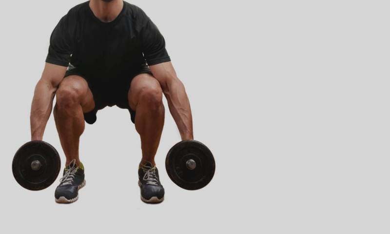 Еще один вид приседаний с гантелями, прокачивающий большую группу мышц и сжигающий жир за счет поддержки высокой частоты пульса. Выполняется с одной гантелью большого веса в обеих руках. В начальном положении и на протяжении всего упражнения руки опущены вниз. Опускайтесь вниз в приседании до тех пор, пока гантель не дойдет до уровня пола, спину держите прямо и напрягите мышцы корпуса. Силой ног поднимитесь вверх, не меняя положения спины. Не делайте резких движений, не раскачивайтесь.