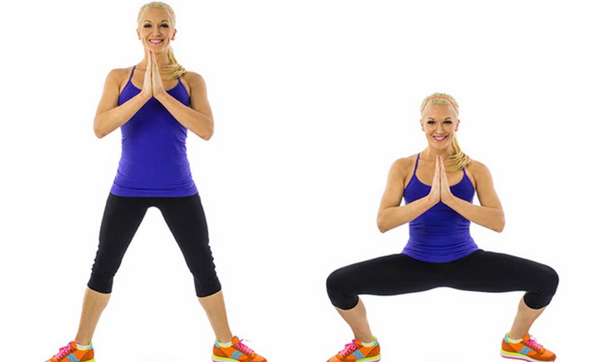 - Нужно стать прямо, поставить ноги на ширину плеч и развести носки в стороны. С ровной спиной нужно присесть, затем вернуться в исходное положение. Выполнить 25 приседаний.