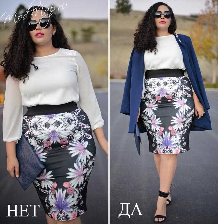 5. Очень узкая юбка карандаш с крупным принтом. Вы скажете, что такую юбку категорически нельзя носить полным, ДА. Но если дополнить комплект длинным жакетом, полупальто или кардиганом, образ получится модным и стильным. Жакет прикроет проблемные зоны и создаст вертикальные линии, которые вытягивают и стройнят фигуру.