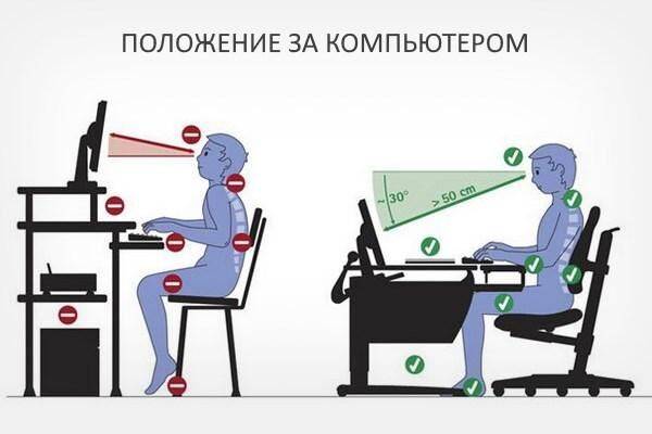 Положение за компьютером на фото ниже. Соблюдение этих правил поможет сохранить здоровье всего организма.
