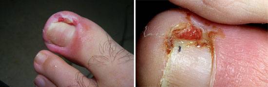 Затягивание болезни приводит к развитию инфекций, что, безусловно, усугубляет ситуацию. Открытые длительное время незаживающие раны – это отличная среда для размножения бактерий. Инфицированная рана заживает медленно, организм же пытается залечить пораженный участок, в результате на месте врастания ногтя образуется ярко-красная грануляционная ткань. Если не начать лечение или начать неправильное лечение, грануляция становится плотной, фаланга меняет форму, решить проблему консервативными методами становится невозможно. Кроме того, вероятно развитие воспаления мягких тканей не только пальцев, но и всей стопы, которое в случае бездействия может распространиться на кости и привести к остеомиелиту.