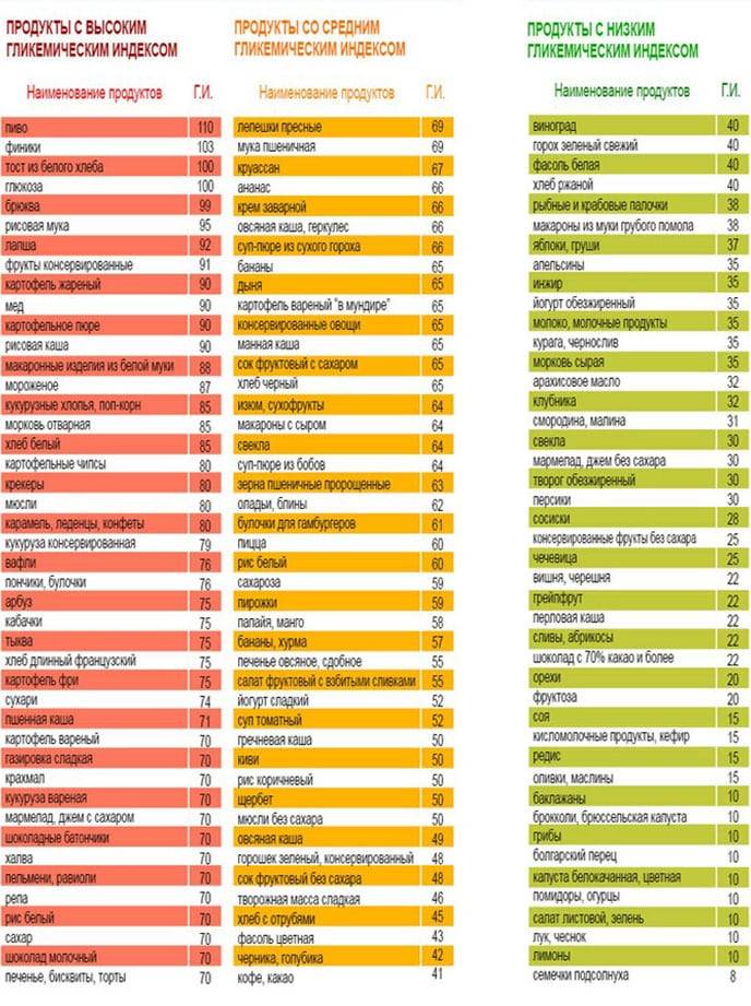 - В меню должны отсутствовать простые углеводы и продукты с повышенным показателем гликемического индекса (таблица с ГИ представлена ниже).