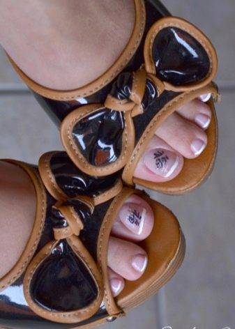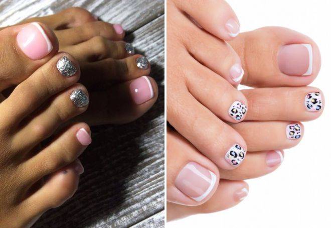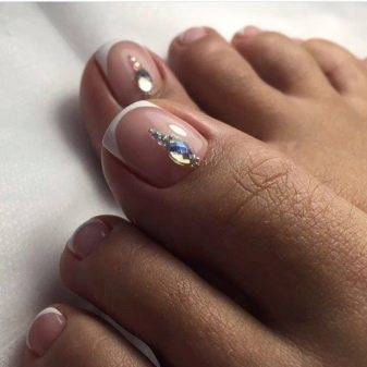 . Если вы хотите добавить привлекательности и броскости своим ножкам, дополните классический дизайн отделкой одного или двух пальчиков. В этом случае можно использовать контрастный лак или декор.