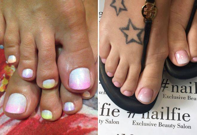 Очень популярен в последнее время французский педикюр, выполненный в расцветке омбре. Плавный переход из одного цвета (в основном отталкиваются от основы ногтя) в другой оставляет незабываемые впечатления. Многие профессионалы для этого используют до пяти промежуточных оттенков, чтобы подчеркнуть необычайность выбранного дизайна. При желании эту технику можно применить по отношению всех пальцев – начинать, к примеру, с ярко-красного, а к мизинцу расцветка может стать нежно-розовой. Некоторые профессионалы предлагают исполнять такой градиент в различных направлениях: вертикально, горизонтально и по диагонали.