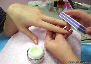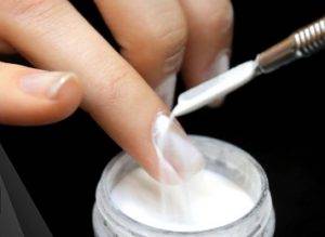 Укрепление ногтей акрилом. На предварительно отшлифованную поверхность ногтя наносится смесь из акриловой пудры (полимер) и ликвида (мономер). Данная масса очень быстро затвердевает, поэтому наносится в течение нескольких минут. В итоге получаются прочные ногти, защищенные от внешних агрессивных факторов.