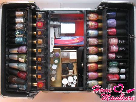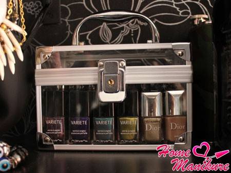 Для девушек, коллекция лаков которых является достаточно внушительной, можно порекомендовать использование многоступенчатых подставок и дисплеев. Еще одним замечательным вариантом будет специализированный чемоданчик. Он может различаться размерами, наполнением и материалом отделки. Девушкам, самостоятельно занимающимся маникюром дома, идеально подойдет небольшой чемодан, изготовленный из пластика либо дерева. Зачастую он содержит внутри отсеки, позволяющие хранить как лаки, так и другие инструменты для маникюра.