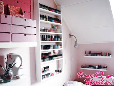 Аксессуары, о которых далее пойдет речь, чаще встречаются в салонах и в специализированных магазинах, где объем флаконов очень велик. При желании, конечно, их можно приобрести и в личное пользование. Настольный или напольный комод, а также витрина с прозрачными выдвижными ящиками способны вместить в себя огромное количество бутылочек. Все лаки располагаются в ряд, поэтому при необходимости можно сразу найти подходящий цвет.