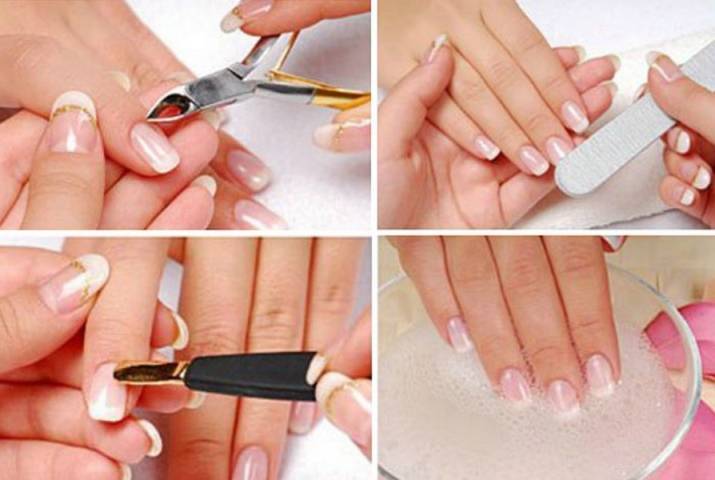 Форма ноготков шлифуется пилочкой в одном направлении. Околоногтевую кожу можно смягчить маслом или подержать руки в мыльной ванночке. Затем кутикула нежно отодвигается к краю пластины. Чтобы лаковое покрытие держалось подольше, необходимо обработать ноготки пилочкой для шлифовки, после чего укрепить их сывороткой или кремом.