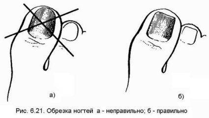 - Стрижка ногтей с помощью специального инструмента. Обрезать пластины нужно ровно, избегая закруглений и острых боковых углов. Любые изменения траектории роста могут привести к последующему в кожу. Запрещено срезать длину под корень из-за высокой вероятности травмирования и инфицирования.