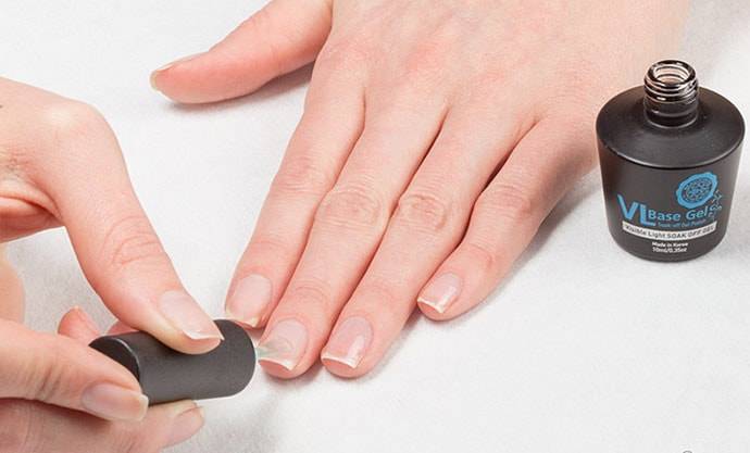 Базу следует наносить тонким слоем на всю поверхность ноготка, но не заходя на кожу. Этот слой нужно высушить в лампе. Время сушки зависит от выбранной фирмы базы.