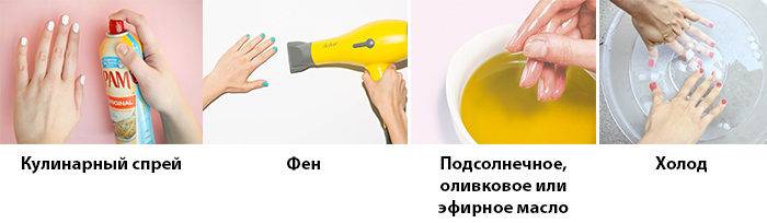 Если заранее не были приобретены специальные маникюрные средства для ускорения высыхания покрытия, можно воспользоваться доступными средствами, имеющимися в каждом доме.