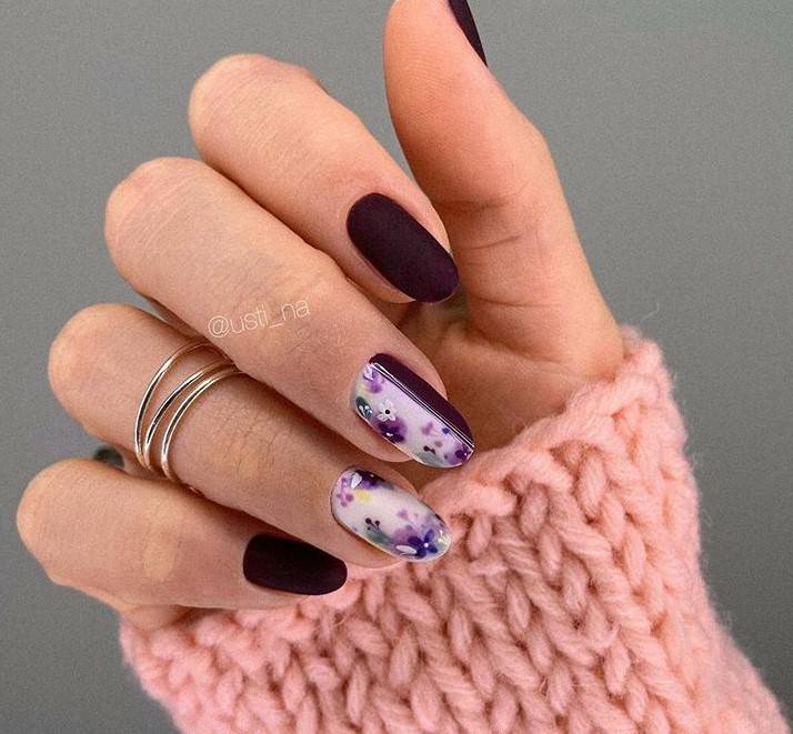 - цветочные бутоны, веточки и листья, в зависимости от выбранных красок и размеров, украсят ногти любых форм и размеров. Пышные цветы, акварельные рисунки пользуются спросом в весенне-летний сезон. Они иллюстрируют романтичные настроения, способствуют безмятежности и умиротворению;