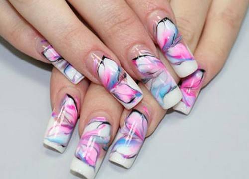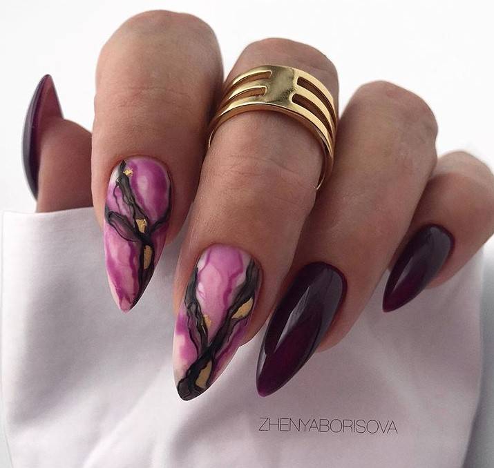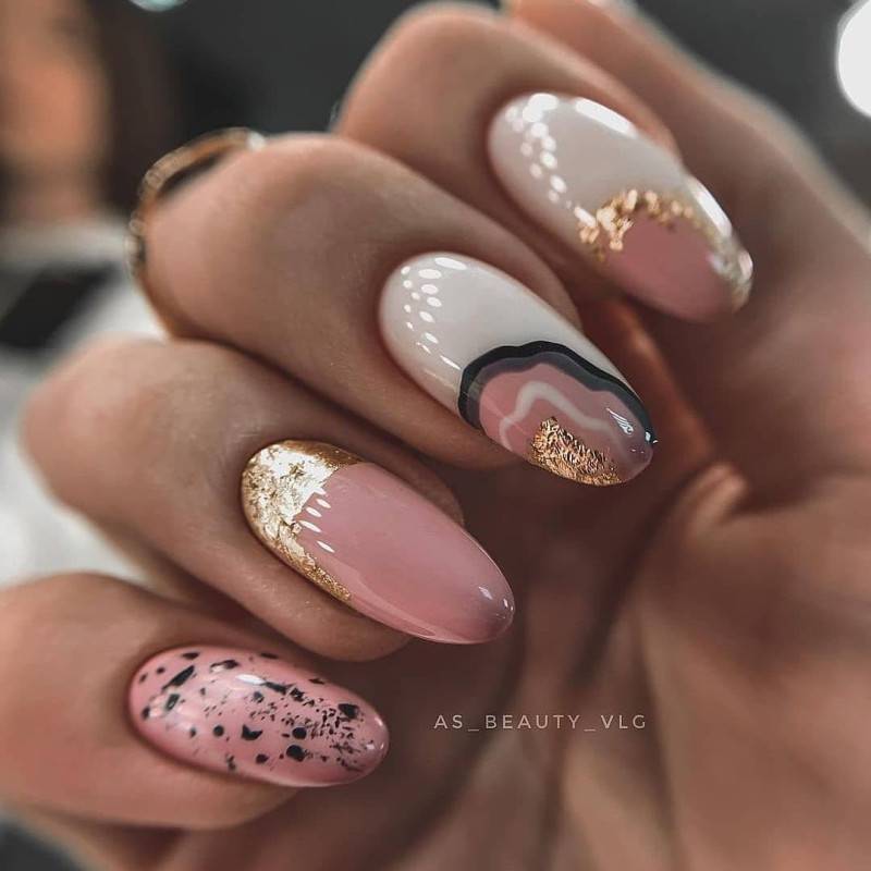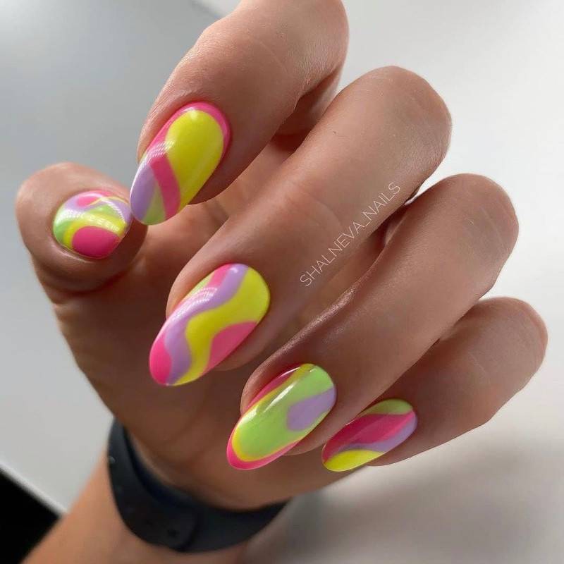 - абстрактные – разводы пастельных цветов, абстрактные контрастные и яркие узоры, которые не повторяются на всех ногтях и т.п.