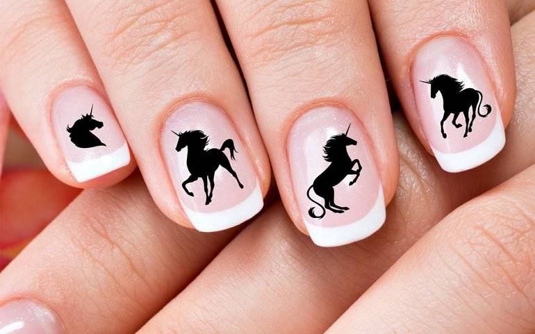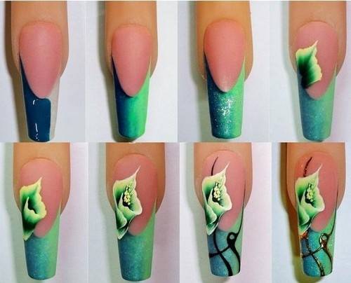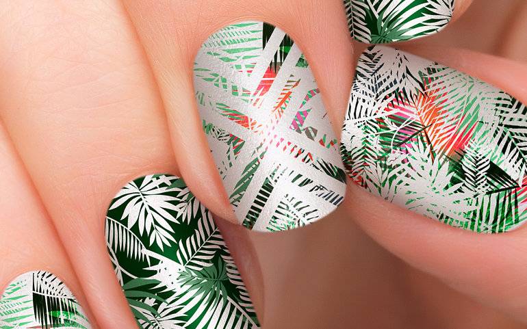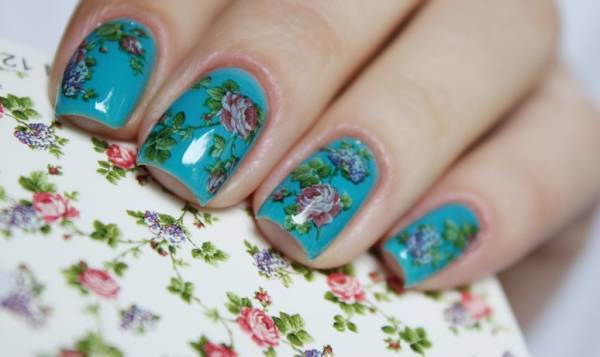 Использование специальных наклеек на ногти. Рисунки нанесены на тонкую пленку, которая при наклеивании незаметна на пластинках. Узоры выглядят очень реалистично. Создается впечатление, что они нанесены кисточкой художника.