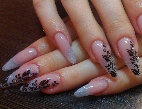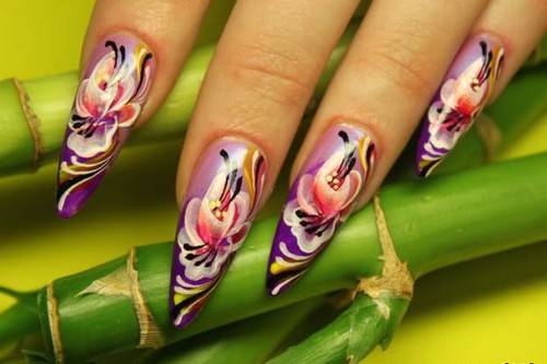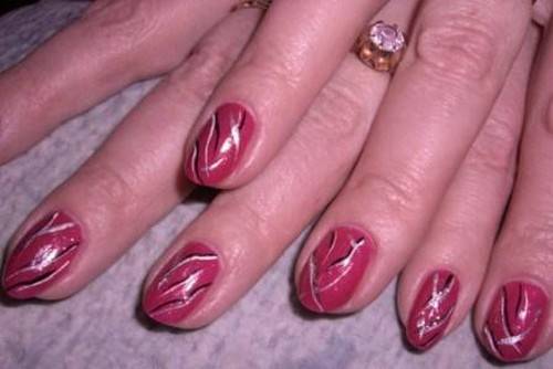 Чтобы сделать маникюр с узором, маникюрщики используют иголки, зубочистки, специальные кисточки, различные по цвету и текстуре лаки, создавая самые разнообразные узоры на ногтях разной длины.