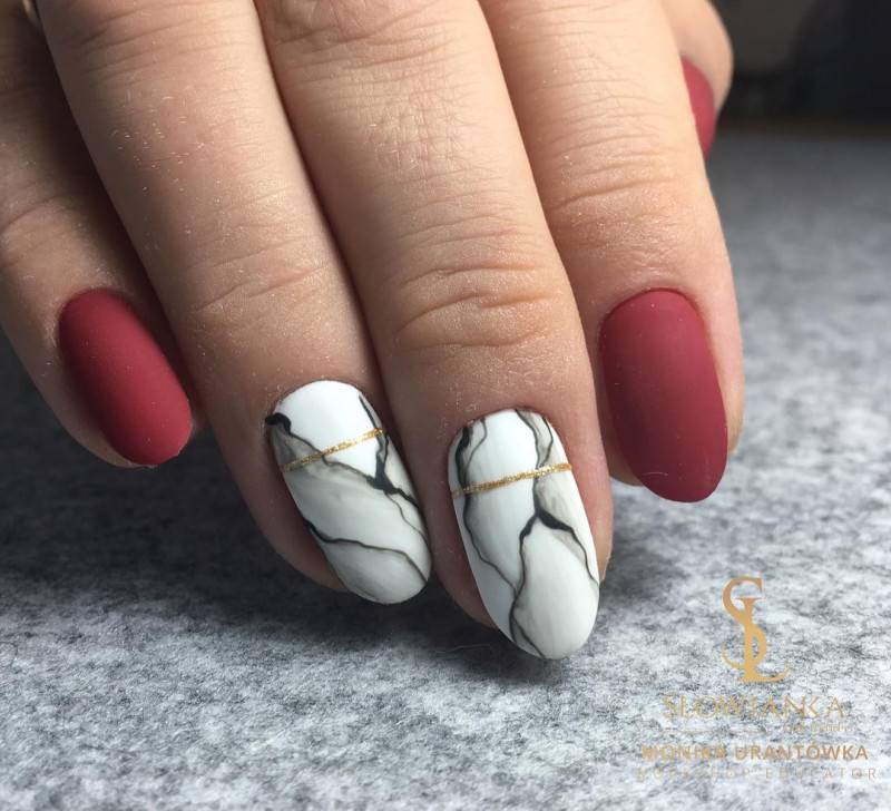 Такой маникюр с узором может выполняться, как на глянцевой, так и на матовой поверхности.