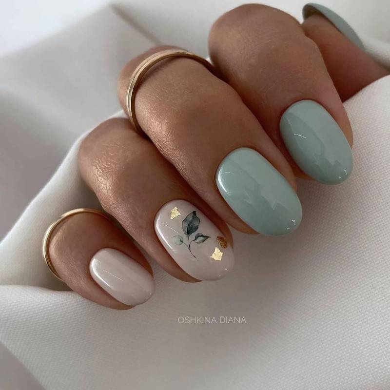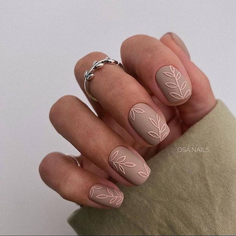 Флористические мотивы украсят маникюр с узором разнообразными веточками, листиками, их комбинациями.