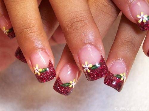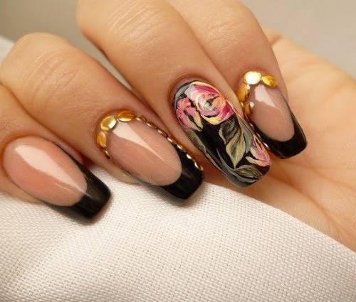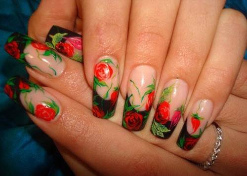 Рисование цветов на ногтях позволяет задавать весеннее настроение в самые лютые холода. Очень элегантно и аккуратно выглядят красивые цветы на фоне французского маникюра. Причем совсем необязательно, чтобы френч был классическим белым: экстравагантный черный выглядит не менее стильно, но более ярко и эффектно. А нарисовать такую розу лаком, или, скажем, мак – не составит труда даже начинающим.