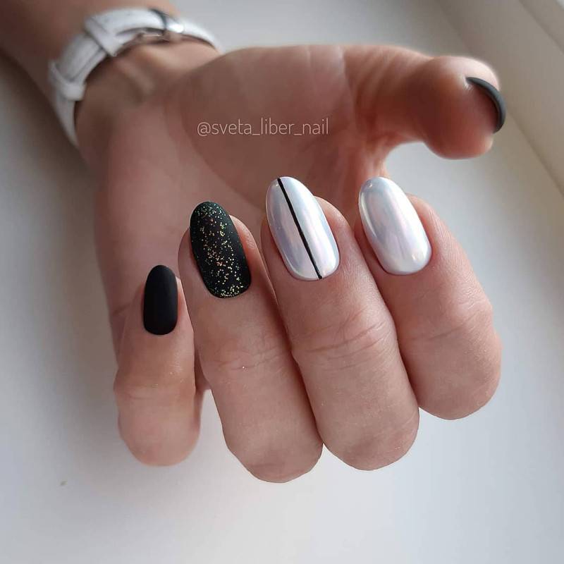 Черно-белая классика прочно удерживает свои позиции в мире. Ахроматический стиль любят многие за простоту и удобство. Не нужно придумывать ничего лишнего, достаточно всего два цвета, чтобы сделать маникюр запоминающимся. Это полоски под зебру или шахматный порядок, стилистика под мрамор, да и множественные чередования цветов.