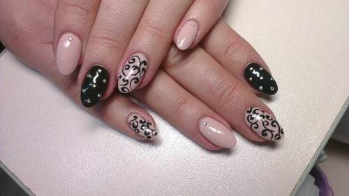 Для вечернего выхода или мероприятия можно смело использовать темные оттенки, как основное покрытие. Но в данном случае лучше обойтись без рисунка, а украсить несколько ноготков небольшим количеством страз или бусин. Такое сочетание всегда выглядит особенно элегантно.