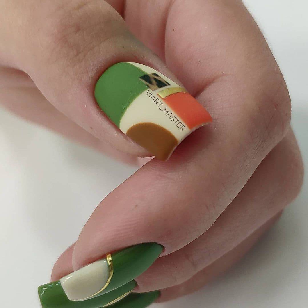- лаконичная, минималистическая геометрия и техника «Color Block», с разноцветными фигурами превосходно подчеркивают аккуратность маленьких ноготков и изысканность длинных. Стиль подходит для миндалевидной или квадратной формы, уместен как на работе, так и в торжественной обстановке;