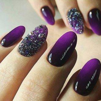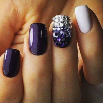 Для вечернего выхода или мероприятия можно смело использовать темные оттенки, как основное покрытие. Но в данном случае лучше обойтись без рисунка, а украсить несколько ноготков небольшим количеством страз или бусин. Такое сочетание всегда выглядит особенно элегантно.