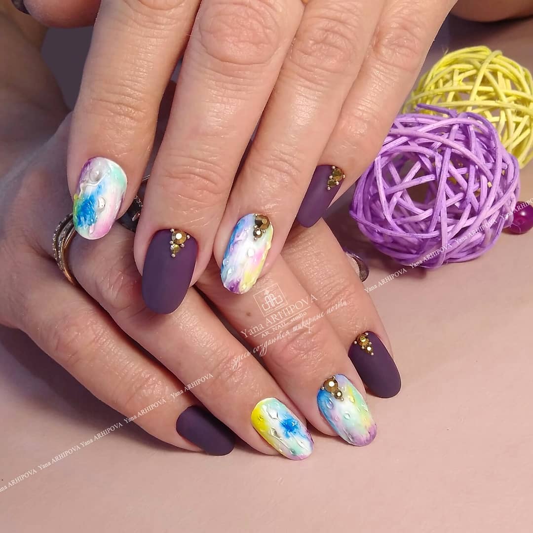 Применяйте всю свою фантазию и пробуйте этот тренд на себе. Выгодно подчеркнут «стеклянный» маникюр насыщенный фиолетовый, синий и зеленый цвета.