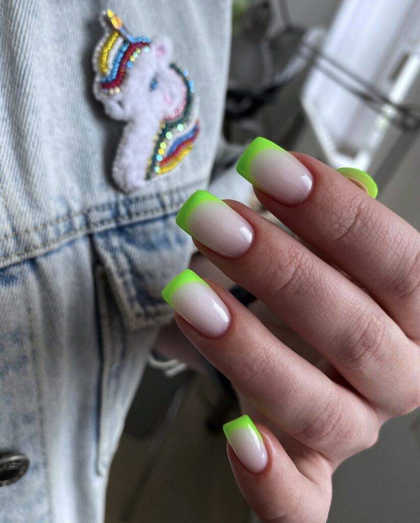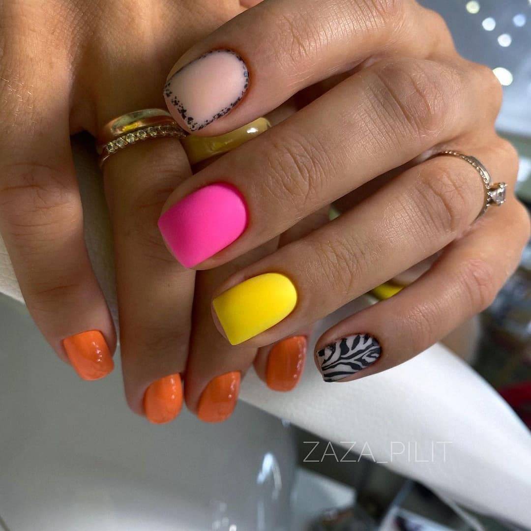 Палитра цветовых решений для выполнения маникюра на короткие ногти не теряет своей актуальности с 2021 года. Это яркая цветная «улыбка» на всех пальцах с контрастным оформлением лунки под любые оттенки.