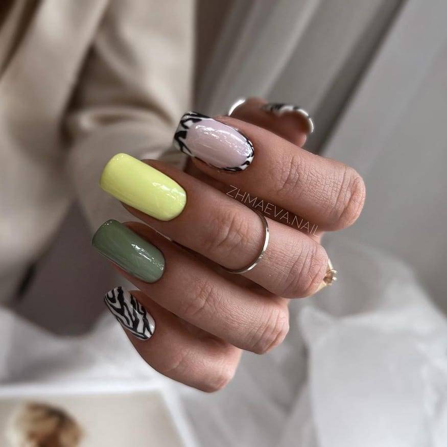 - абстрактные – разводы пастельных цветов, абстрактные контрастные и яркие узоры, которые не повторяются на всех ногтях и т.п.