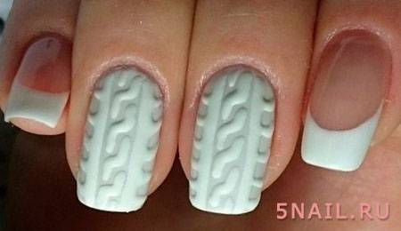 - Акриловой краской нарисовать узор, просушить в лампе. Чтобы зимний вязаный маникюр выглядел объемным и действительно походил на натуральную вязку, нужно наносить краску в несколько слоев, каждый раз суша пальчики в лампе.