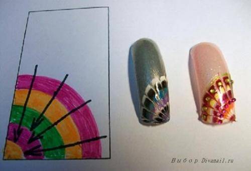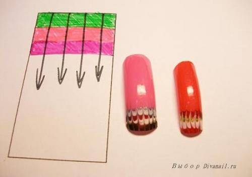 Это несложный маникюр и подойдет тем, кто хочет «набить» руку. Для его выполнения возьмите лаки трех цветов. Затем нанесите на весь ноготь лак, который вы выбрали для основного цвета. Далее, не дожидаясь пока он высохнет, с боку ногтя проведите две параллельные полоски. Для этого вам понадобится оставшиеся лаки разных цветов. После этого возьмите иголку и проведите ей линии следующим образом: с боку ногтя от центра к противоположной стороне под уклоном. То есть они должны располагаться на ногте как открытый веер. После этого нанесите бесцветный лак, чтобы маникюр держался долго. Учтите, что действовать в данном случае надо достаточно быстро. Иначе лак засохнет, и дизайн ногтя не получится. Чтобы сделать такой маникюр, вы можете проявить свою фантазию и поэкспериментировать с цветами и с направлением линий. Поводите иголкой от одного бока ногтя до другого и обратно под прямым углом, и у вас получится совершенно другой рисунок.