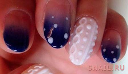 Очень красиво смотрится вязаный дизайн, разбавленный точками. Они придают образу воздушности, пушистости и мягкости.