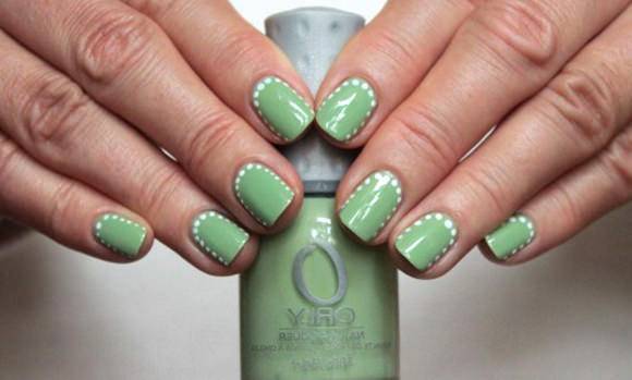 Это тоже довольно простой маникюр, который могут выполнить даже те, кто только учиться делать рисунки иголкой на ногтях. Возьмите два контрастных лака. Желательно еще и закрепитель, чтобы маникюр радовал вас подольше. После этого нанесите на ноготь лак-основу и, не дожидаясь пока она высохнет, по краю ногтя — другой контрастный лак полукругом в виде небольших кружочков. Они должны получиться аккуратными и располагаться на 2-3 мм друг от друга. Далее возьмите иголку и на этих кружочках нарисуйте бантики или сердечки. Учтите, что делать маникюр нужно быстро, и только тогда он получится.