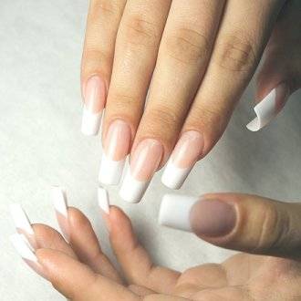 - Наращивание ногтей френч можно делать, используя типсы белого цвета. Так вы будете иметь готовый белый свободный край и идеальную линию улыбки. При закреплении и покрытии таких типс нужно использовать прозрачный гель