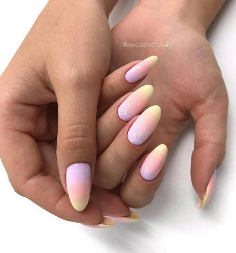 Миндаль — универсальная и очень красивая форма ноготков, которая зрительно удлиняет пальцы. Для неё будет идеальным вертикальный градиент, разноцветный дизайн, техника с акцентом на кончики ногтевой пластины.
