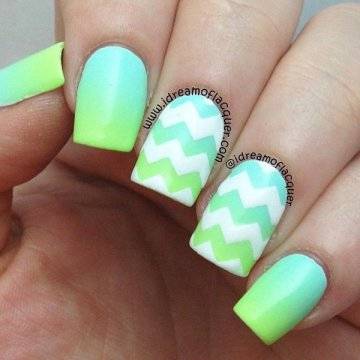 Новинка сезона 2024 — геометрический или графический градиент. Для его создания мастер использует два цвета — белый и любой цветной. Выполняют маникюр кистью, где одновременно с растяжкой цвета формируется рисунок ромбов с небольшим гранями.