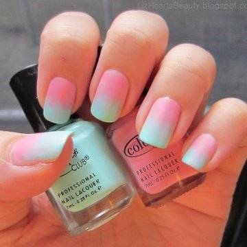 Можно обойтись растушевкой кисточкой, но это требует недюжинного мастерства. Самое рациональное решение задействовать помимо кисти еще и спонж. Лаки в том же порядке наносят на кусочек прямоугольной губки, так, чтобы цвета контактировали между собой. Спонж прикладывают к ногтю, приблизительно совмещая границы двух оттенке на ногтевой пластине и «инструменте».