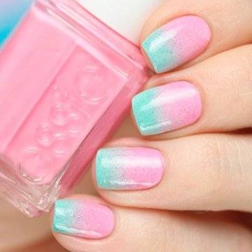 Покрываем ногти базовым слоем гель лака. Это может быть белый или розовый оттенок, так как он более светлый в выбранном сочетании розового и голубого. На базовый слой наносим выбранные для градиента оттенки – розовый в верхней части и голубой – в нижней. Лаки можно наносить в стык или оставлять небольшой промежуток, если это темные, контрастные тона, чтобы не вымазать кисть. Кисточку смачиваем в клинсере, чтобы добиться эффекта легкой влажности. Потом её удобно вытирать о ватный диск, также смоченный в клинсере. Некоторые мастера используют для работы влажные детские салфетки. Кисть изначально промакивается салфеткой, а затем все остатки лака также снимаются с кисти влажной салфеткой в процессе работы. Держа кисточку практически параллельно ногтю, начинаем от кутикулы «стягивать» розовый цвет вниз легкими касаниями, двигаясь из стороны в сторону